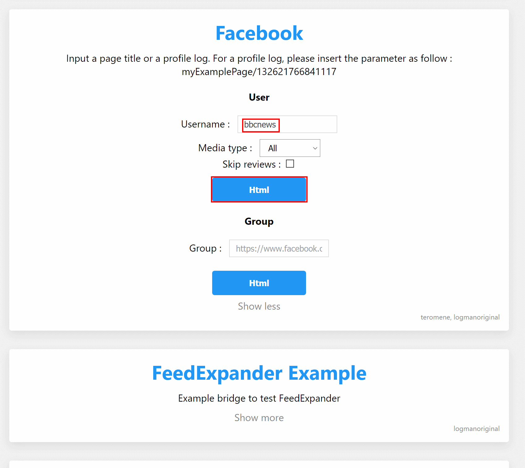 For example, you can generate an RSS feed for a public Facebook page. Configure the page name and click on the "Html" button: