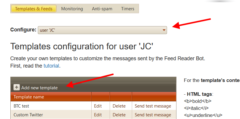 Select your account or the channel/group you want to configure, then click on "Add new template":
