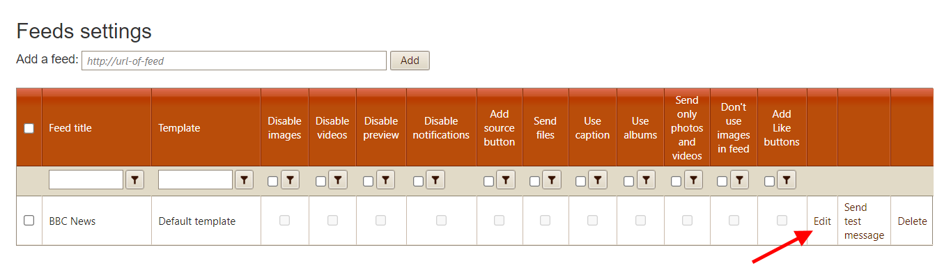 In the "Feeds settings" grid, click on "Edit" for the feed you want to translate: