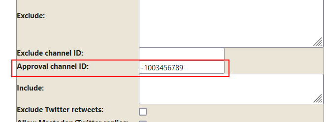 To do that, enter the identifier of a channel (where all messages will be sent, for you to approve) in the "Approval channel ID" template setting (in the "Exclude/Include" section):