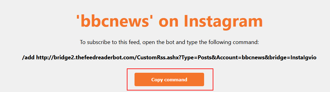 https://bridge2.thefeedreaderbot.com, scroll down to the "Instagram" bridge (other bridges exist, using different websites, with various refresh rates), and enter the account you want the bot to follow: