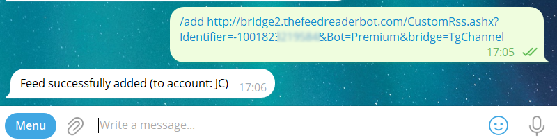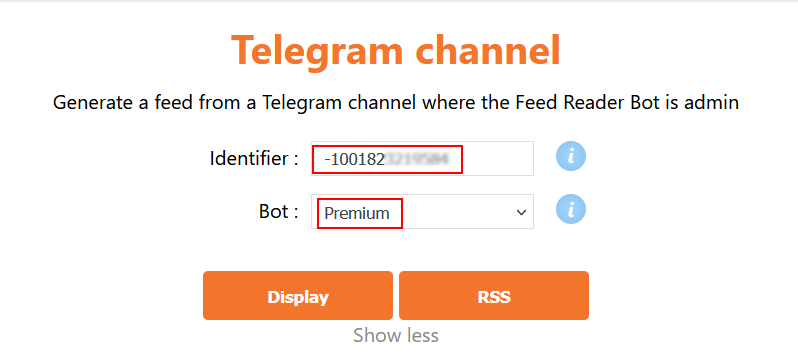 https://bridge2.thefeedreaderbot.com, scroll down to the "Telegram channel" bridge, and enter your channel's identifier, and select if you're a premium or elite subscriber: